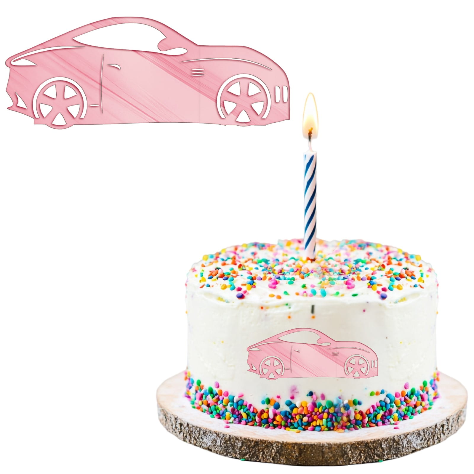 Dekor na bok tortu i babeczki – samochód z plexi lustrzanej. Złoto, srebro, różowe złoto lub czarny połysk. Idealny na urodziny chłopca i fanów motoryzacji.