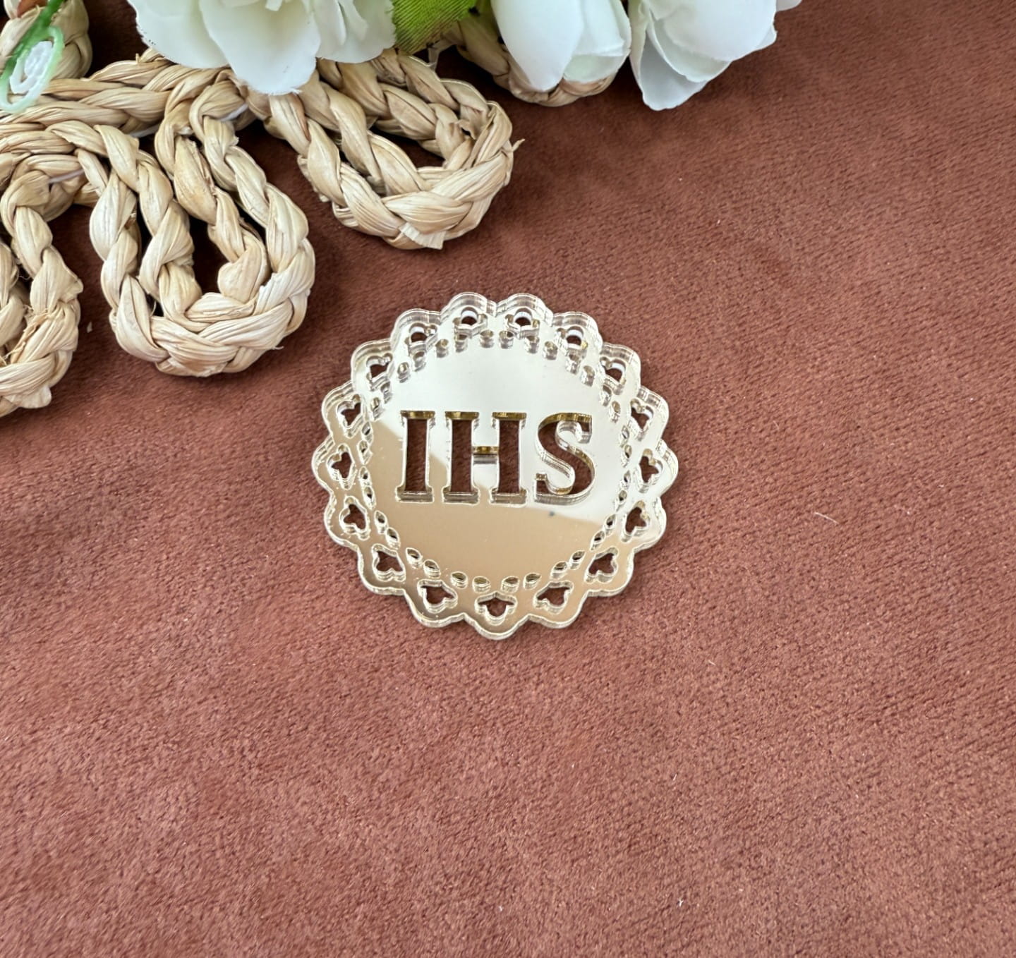 Emblemat na bok tortu – ażurowa koronka z IHS, plexi lustrzana