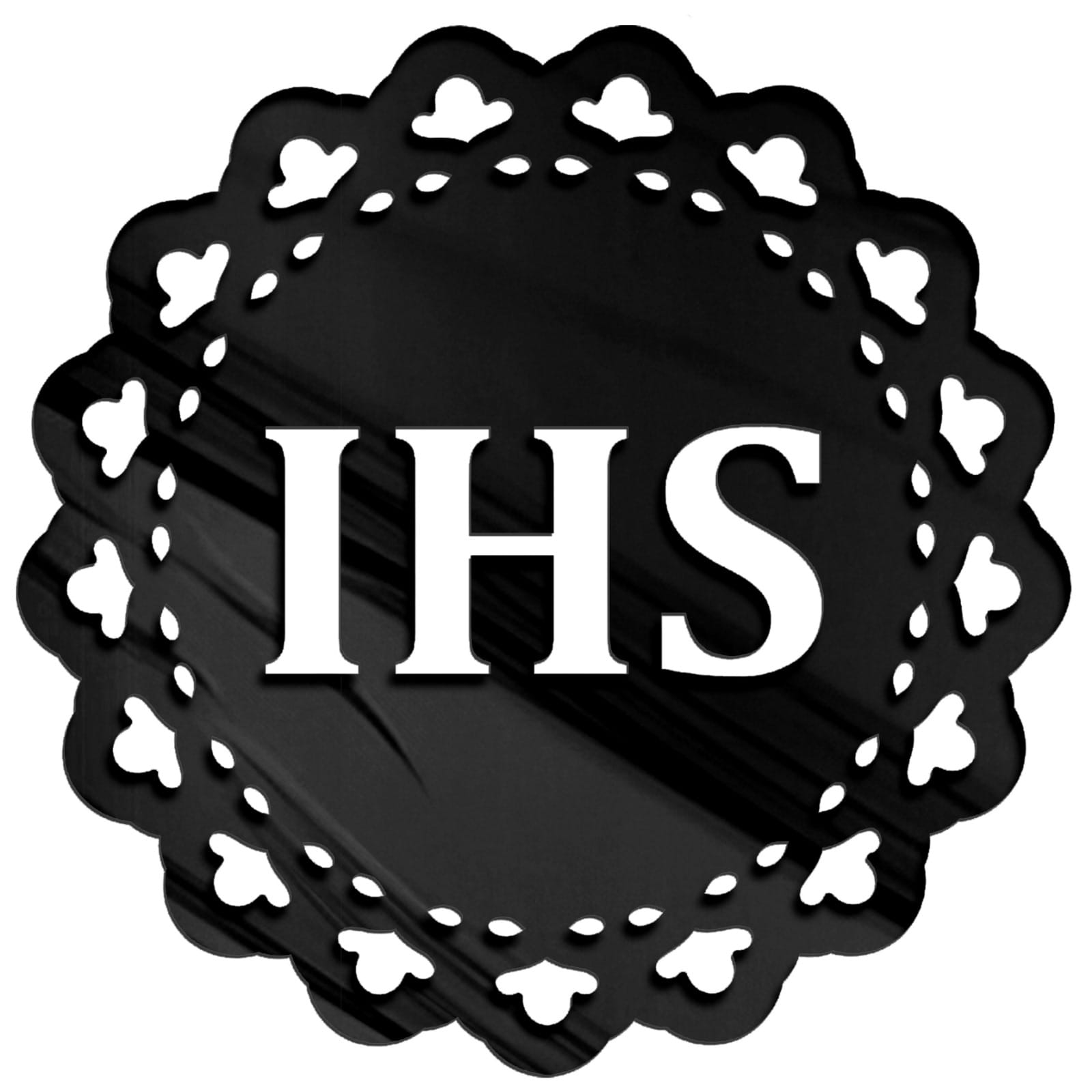 Emblemat na bok tortu – ażurowa koronka z symbolem IHS. Plexi lustrzana (złoto, srebro, różowe złoto) lub czarny połysk. Idealna dekoracja na Pierwszą Komunię Świętą.