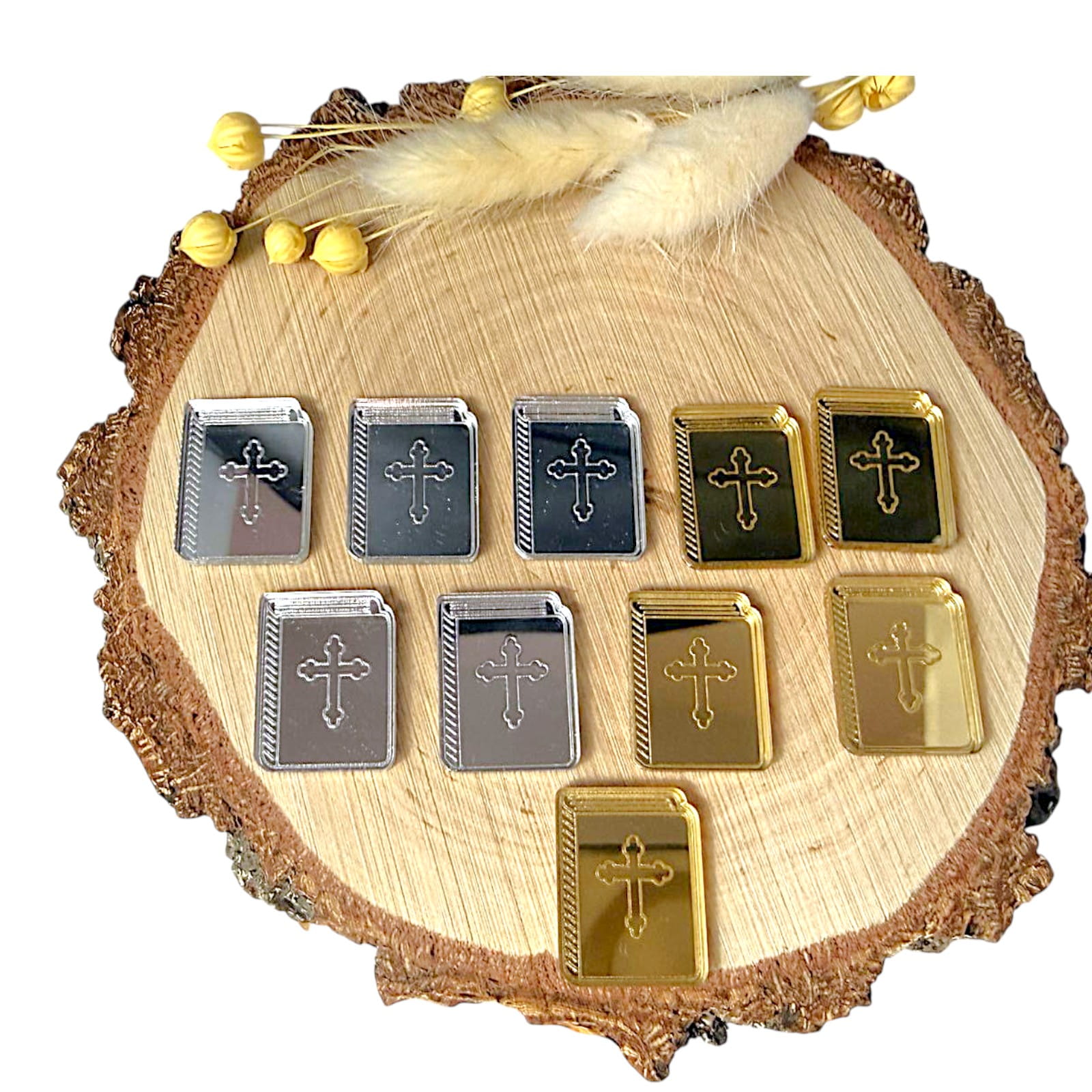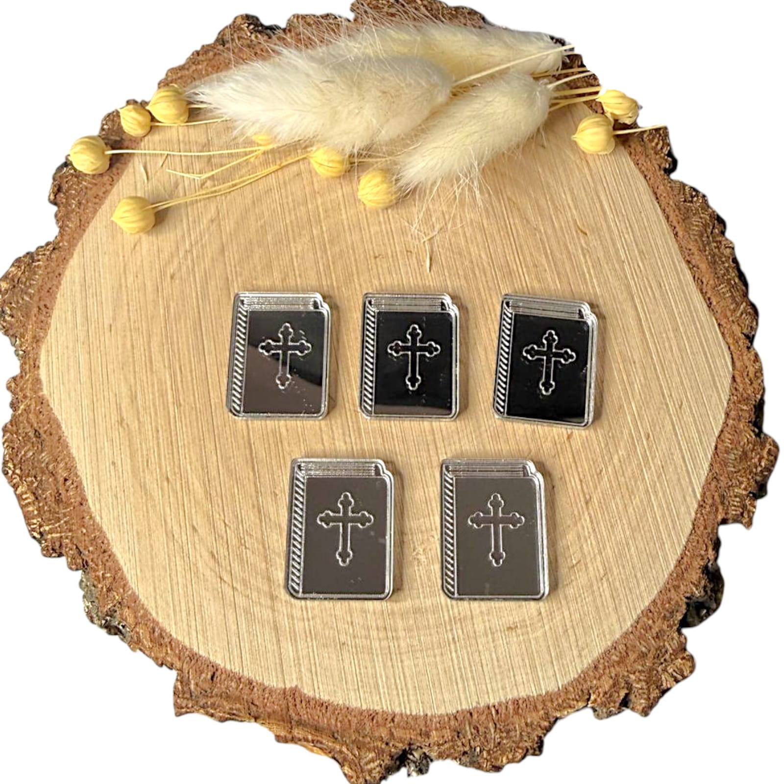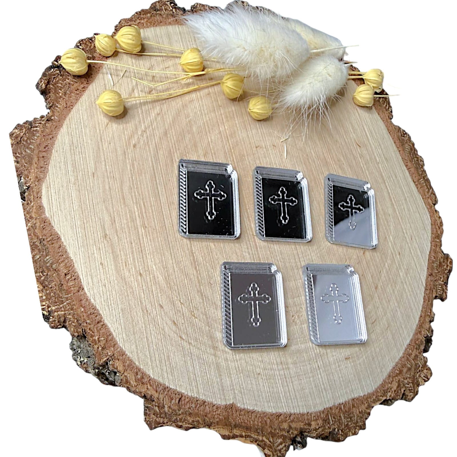 Dekor w formie książeczki, wykonany z plexi lustrzanej, stanowi stylowy dodatek do prac rękodzielniczych o tematyce religijnej. Odbijająca światło powierzchnia nadaje elementowi elegancki wygląd, który doskonale uzupełnia pamiątki komunijne, dekoracje aniołków oraz projekty DIY.