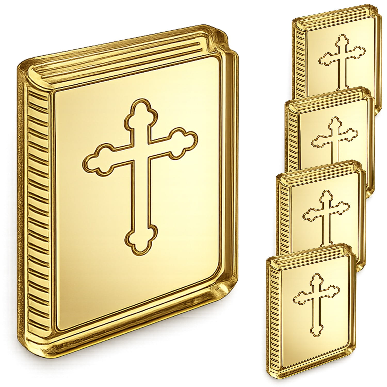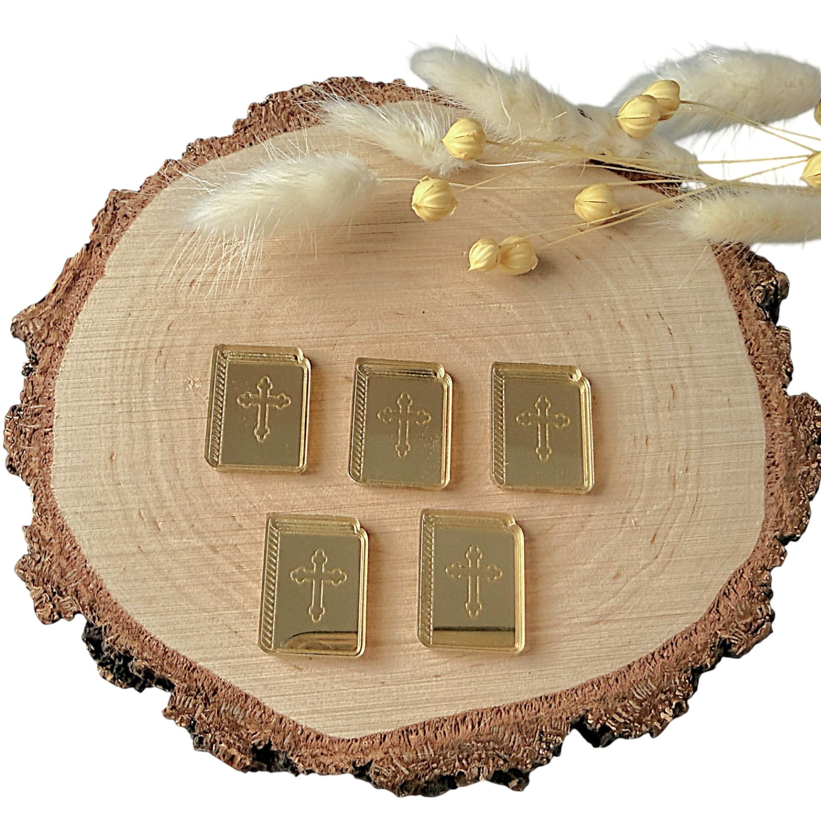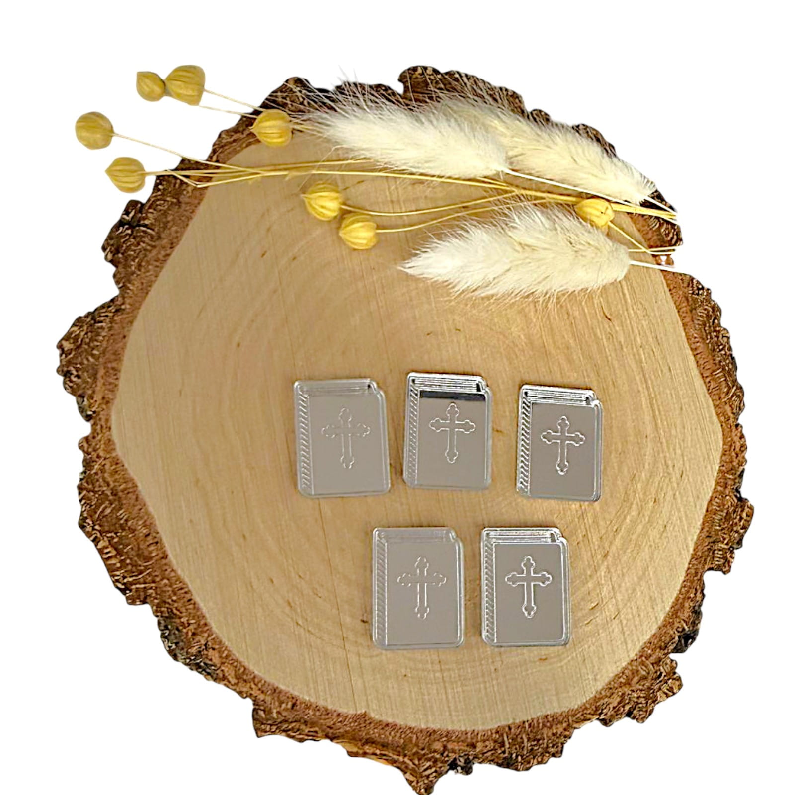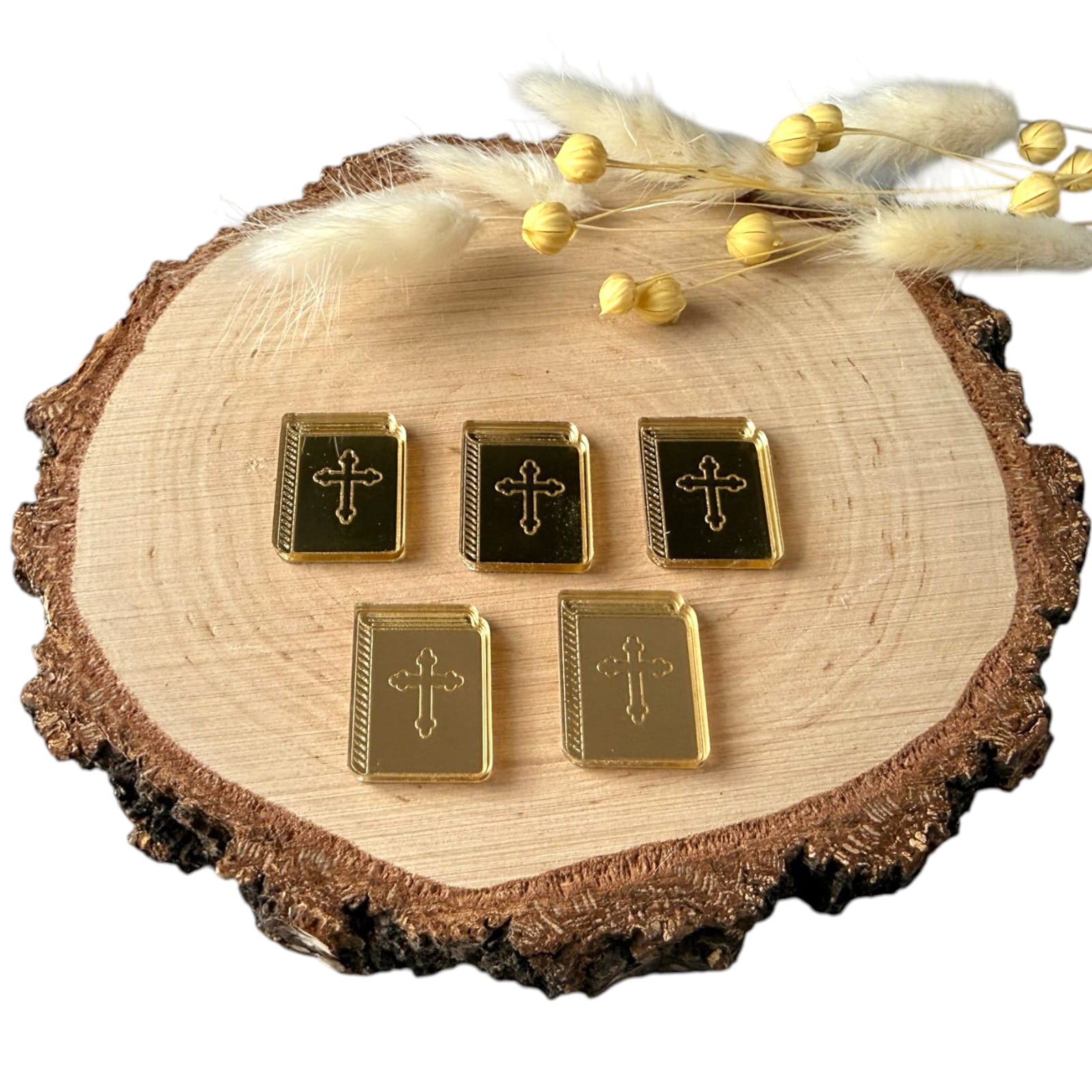 Dekor w formie książeczki, wykonany z plexi lustrzanej, stanowi stylowy dodatek do prac rękodzielniczych o tematyce religijnej. Odbijająca światło powierzchnia nadaje elementowi elegancki wygląd, który doskonale uzupełnia pamiątki komunijne, dekoracje aniołków oraz projekty DIY.
