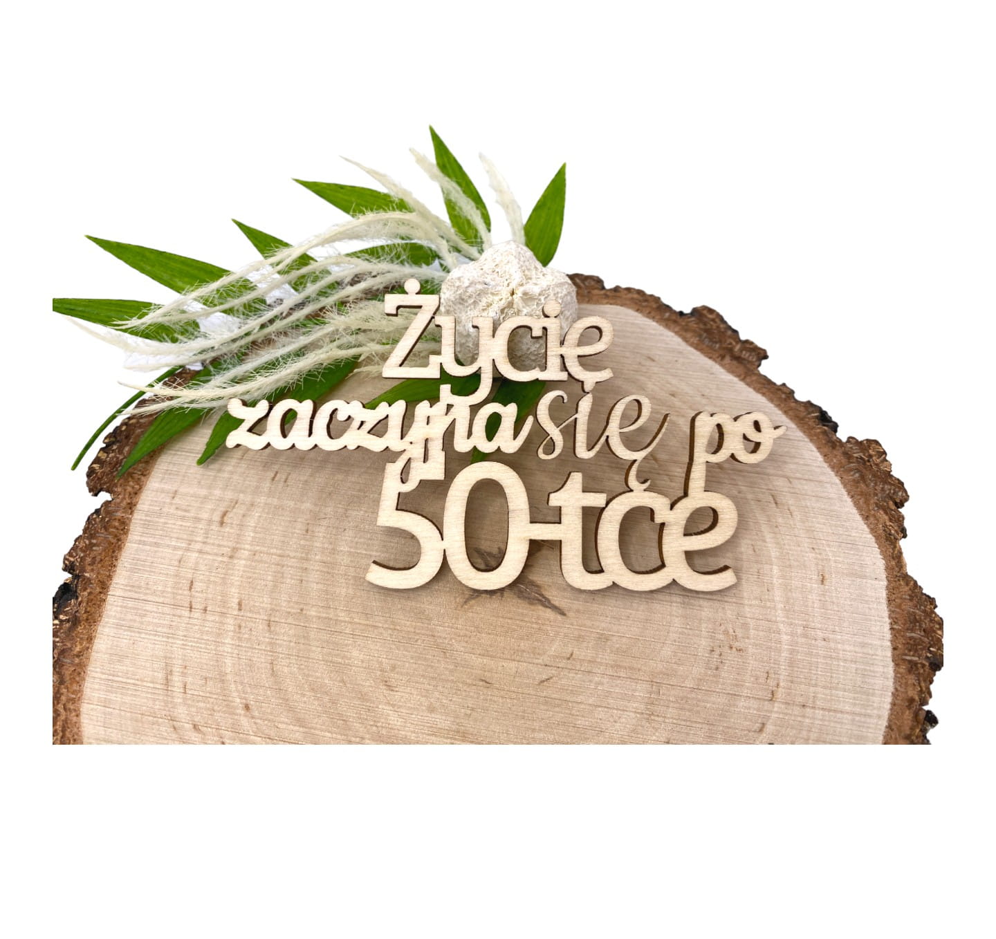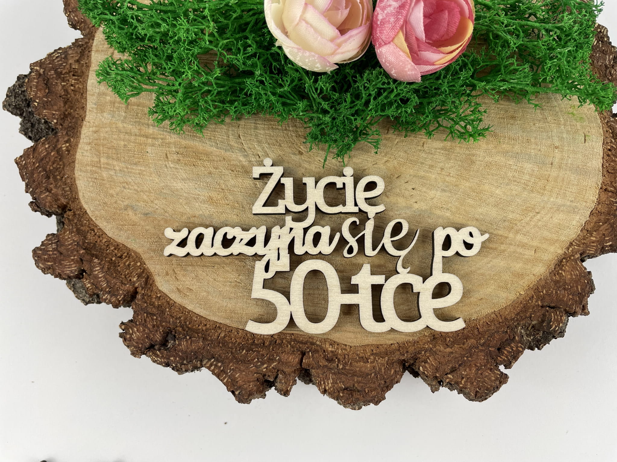 Napis Życie zaczyna się po 50 tce 5 x 10 cm.