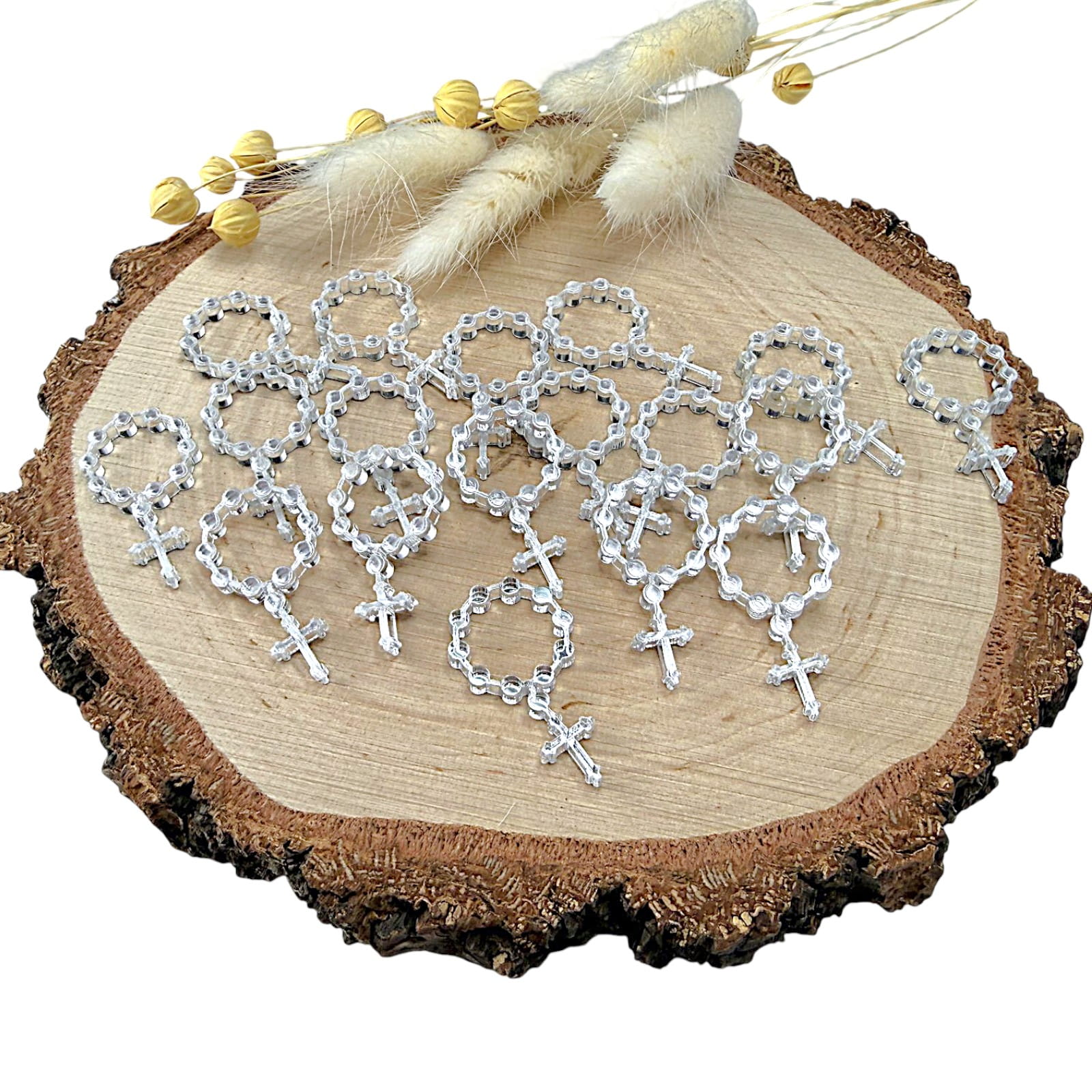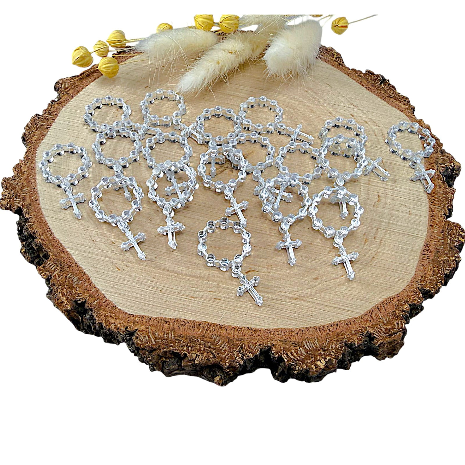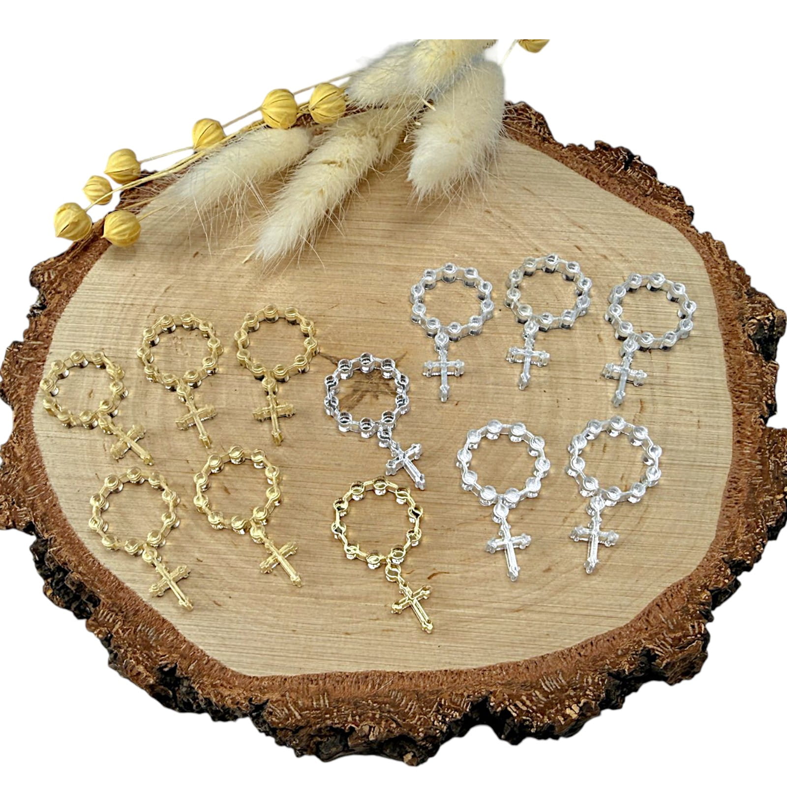 Dekor w kształcie różańca, wykonany z plexi lustrzanej, to elegancki i symboliczny dodatek do projektów rękodzielniczych o charakterze religijnym. Lustrzana powierzchnia nadaje dekoracji subtelny połysk, dzięki czemu idealnie sprawdzi się w pamiątkach komunijnych, aniołkach, kartkach okolicznościowych oraz dekoracjach sakralnych.