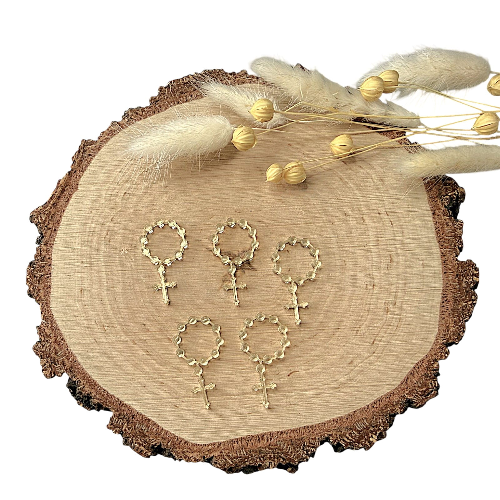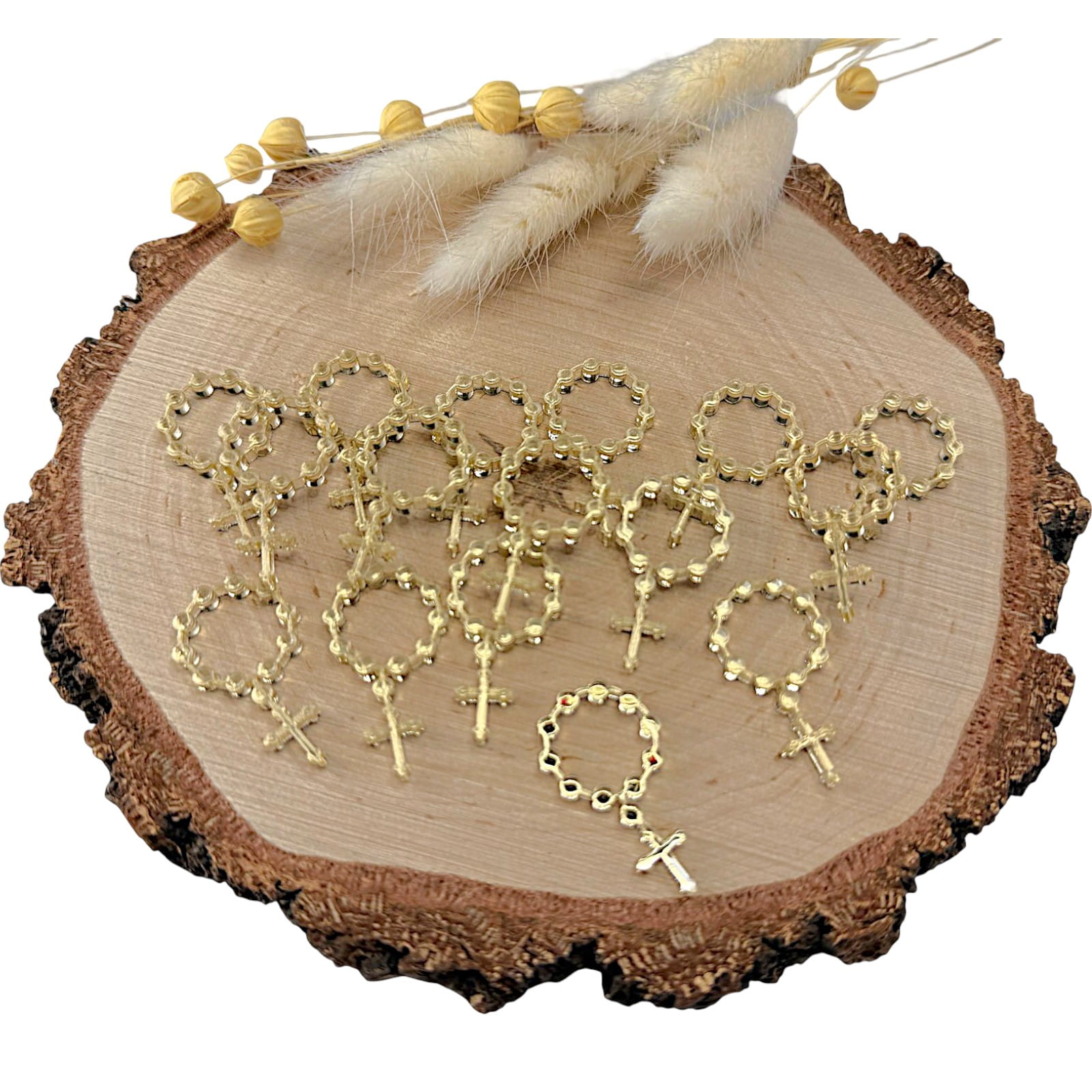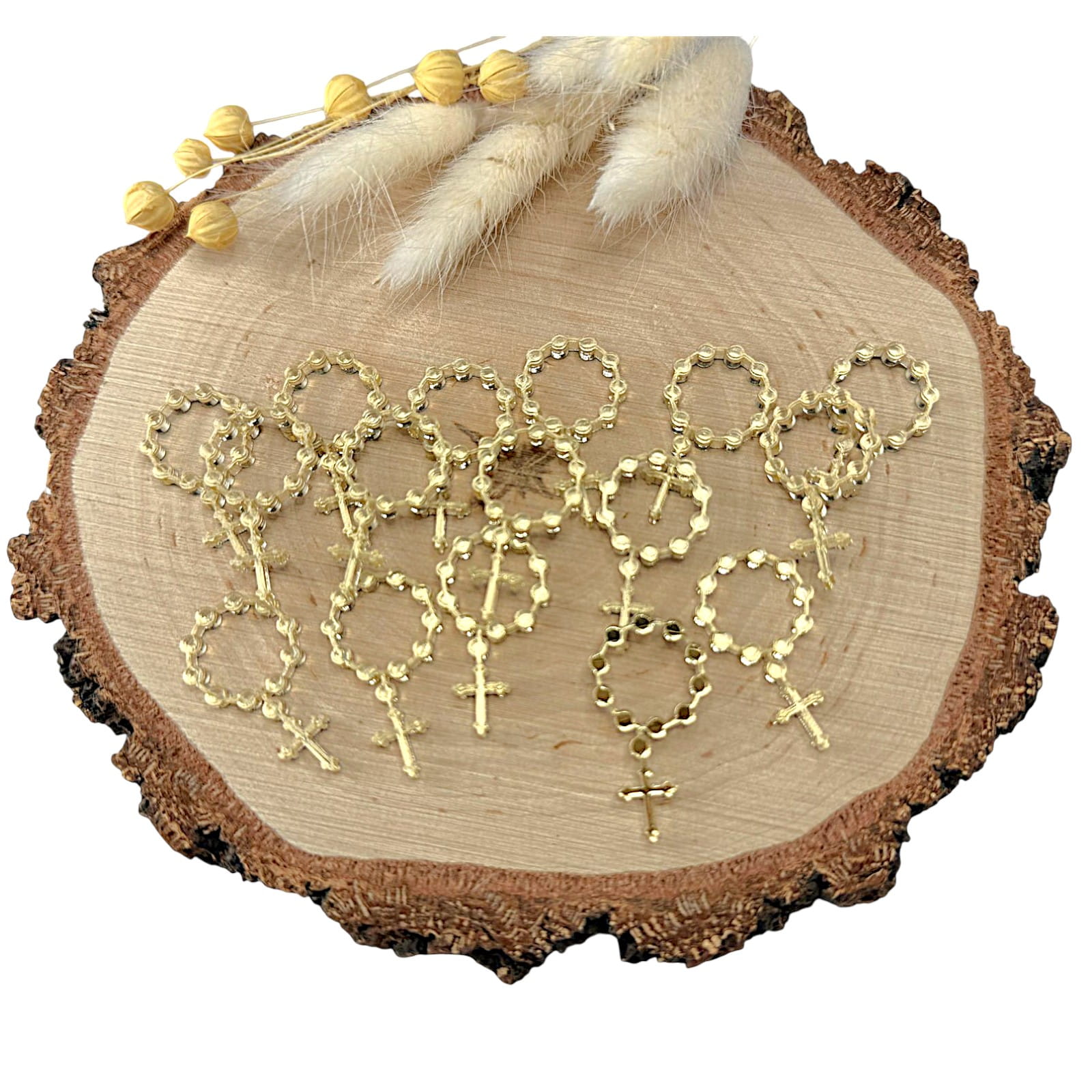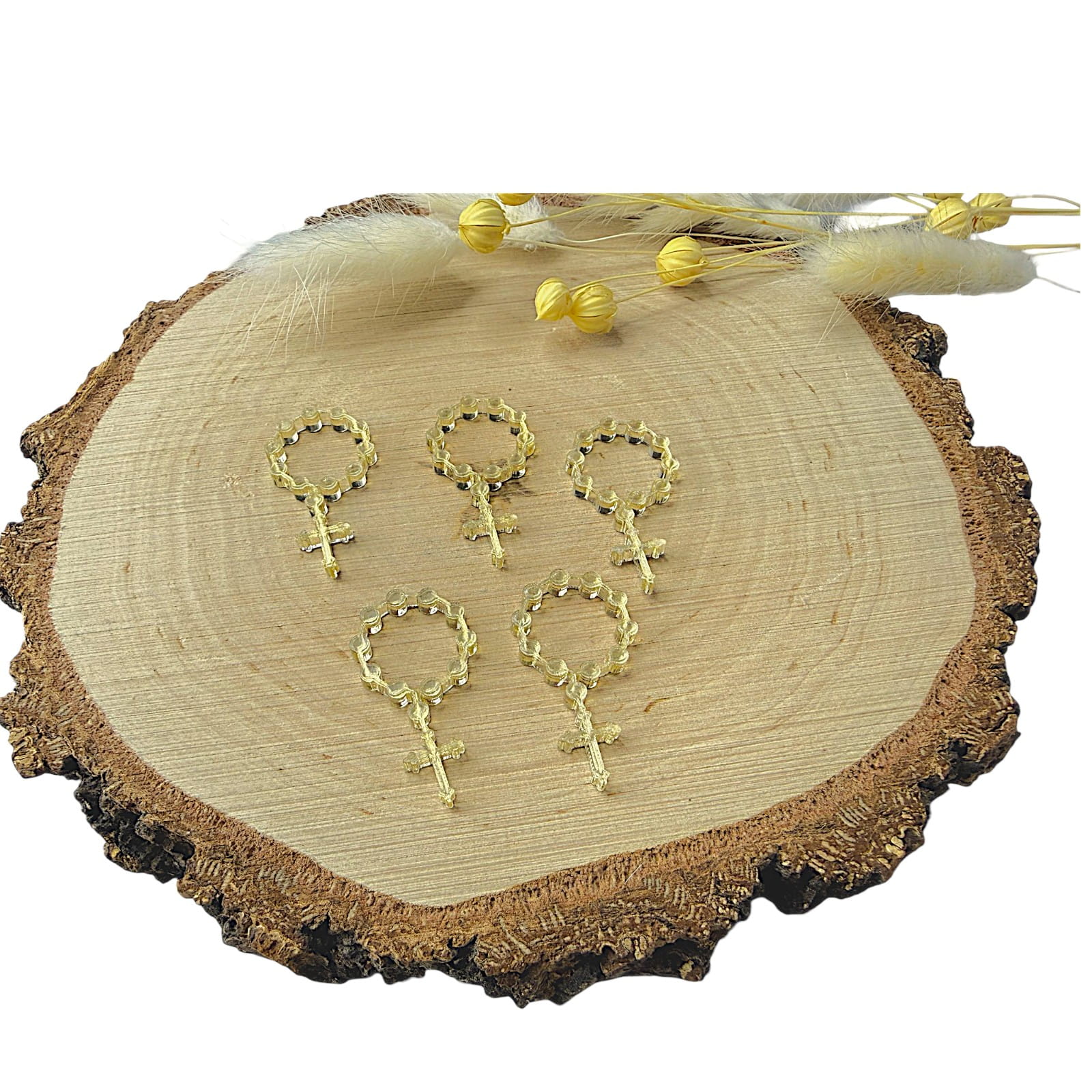 Dekor w kształcie różańca, wykonany z plexi lustrzanej, to elegancki i symboliczny dodatek do projektów rękodzielniczych o charakterze religijnym. Lustrzana powierzchnia nadaje dekoracji subtelny połysk, dzięki czemu idealnie sprawdzi się w pamiątkach komunijnych, aniołkach, kartkach okolicznościowych oraz dekoracjach sakralnych.