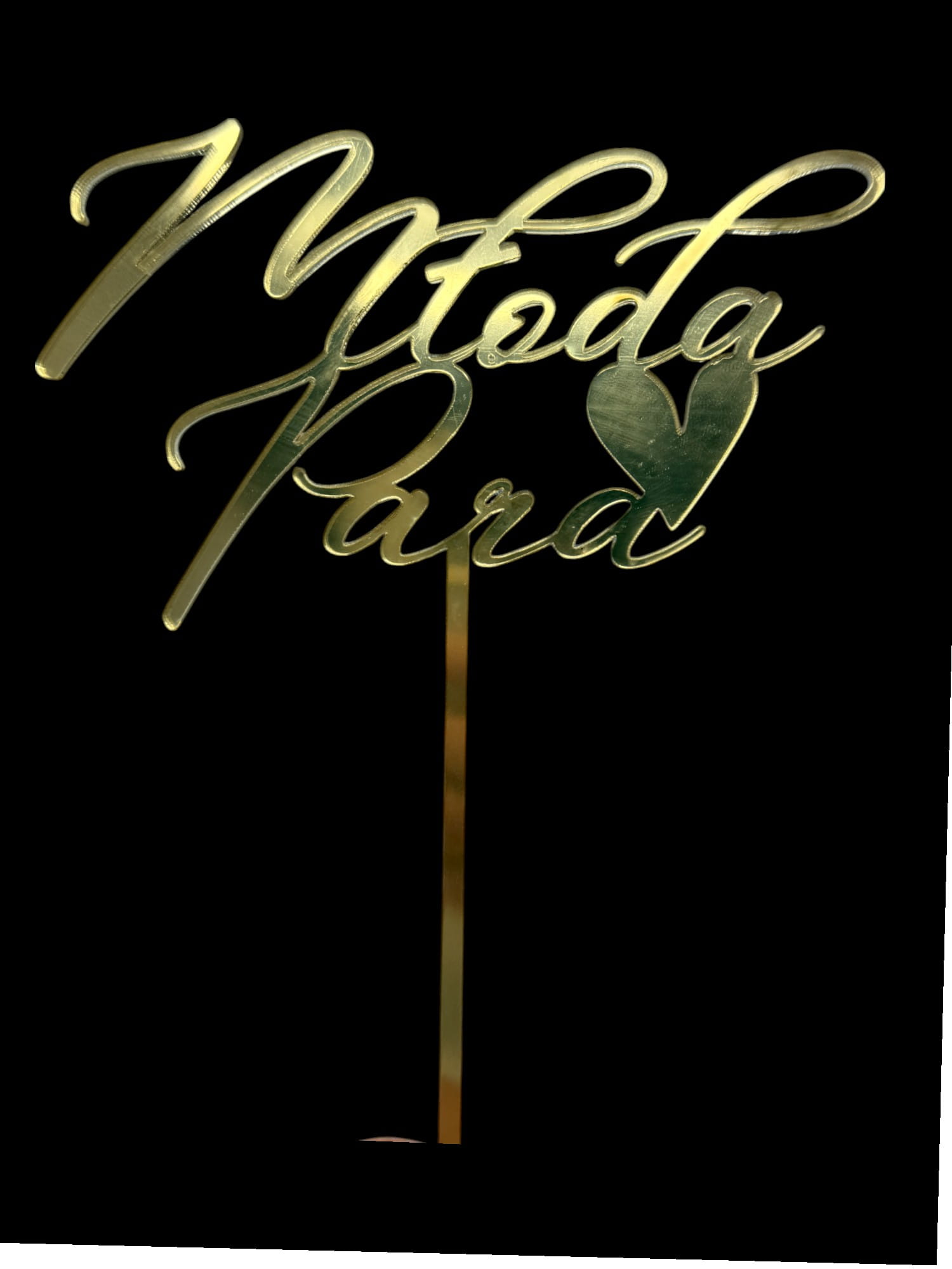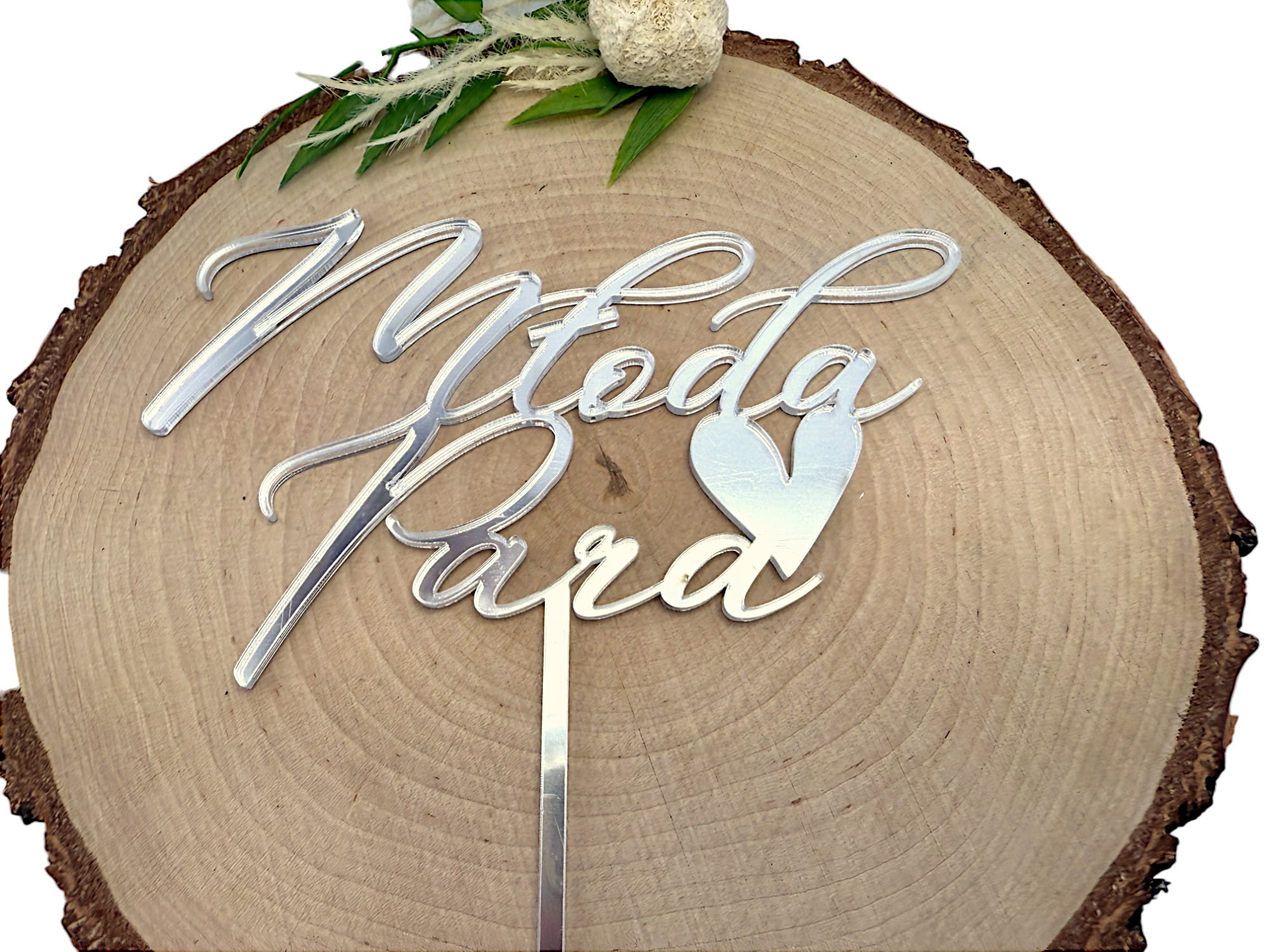 Elegancki topper z napisem „Młoda Para” to klasyczna i efektowna dekoracja tortu ślubnego, która podkreśli wyjątkowość Waszego dnia. Wykonany z trwałej i błyszczącej plexi lustrzanej lub czarnej plexi w połysku, idealnie wpisuje się w każdą stylistykę – od romantycznej po nowoczesną.