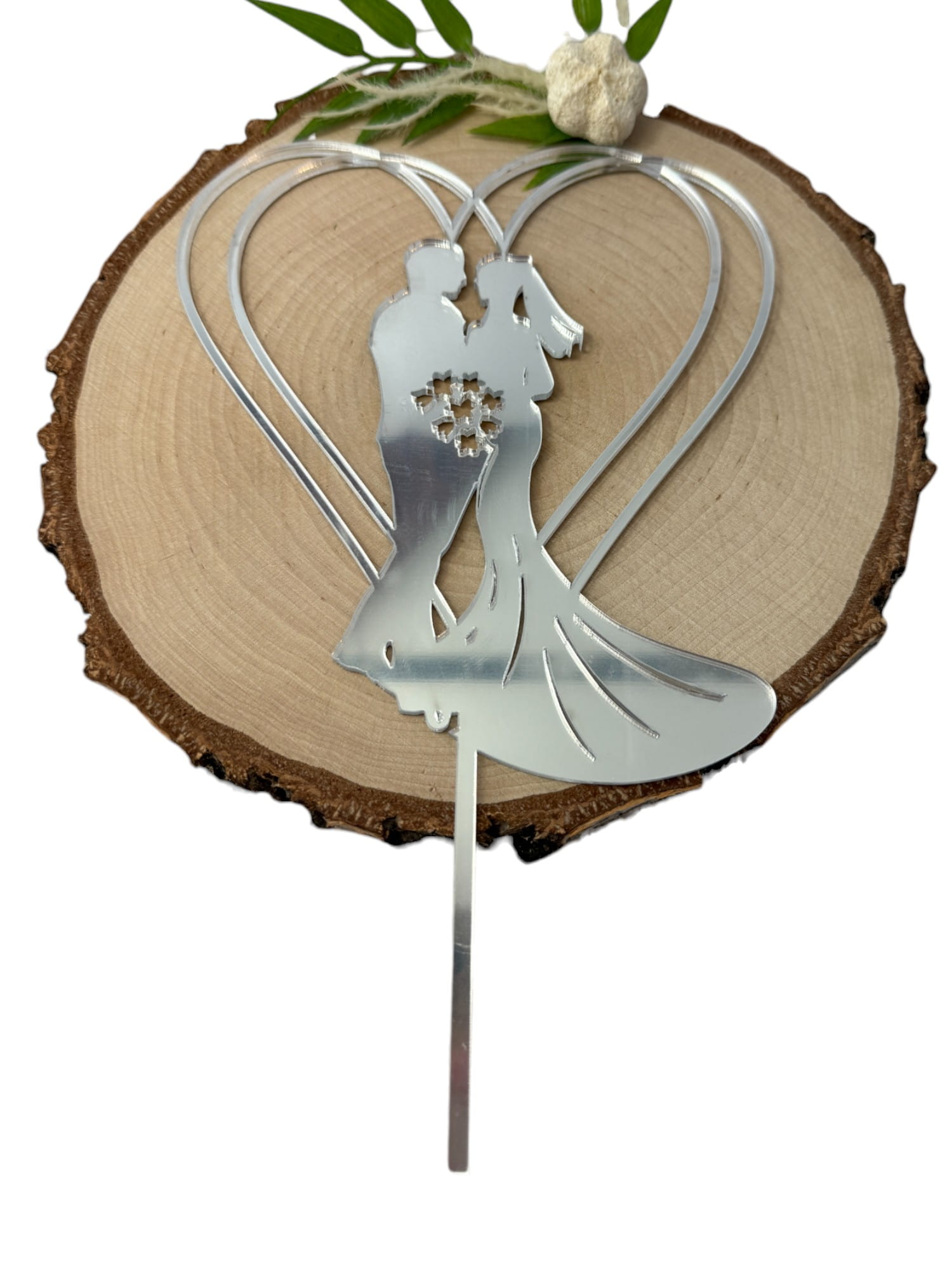 Elegancki topper na tort ślubny. Młoda Para w sercu. Wykonany z lustrzanej plexi. Dostępny w kolorach: złoty, srebrny, różowe złoto, czarny. Idealny na ślub, rocznicę lub zaręczyny!
