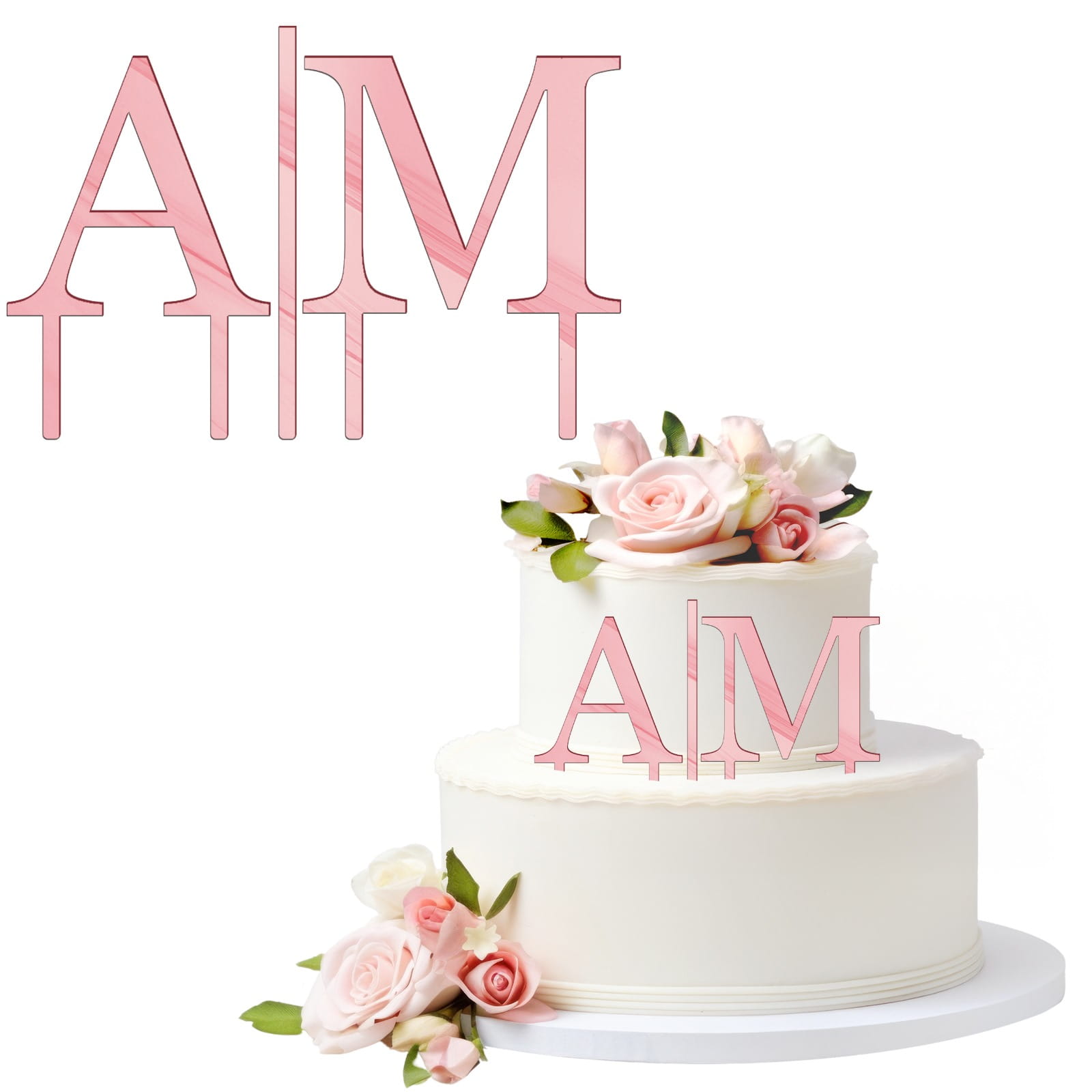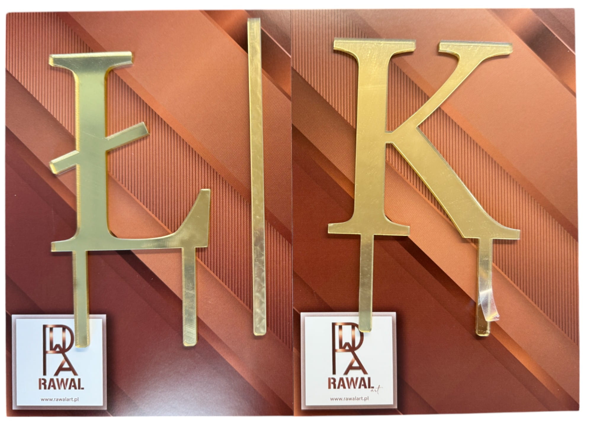 Elegancki topper na tort ślubny z personalizacją – inicjały, imię lub data. Wykonany z lustrzanej plexi. Dostępny w kolorach: złoty, srebrny, różowe złoto, czarny. Idealny na ślub, rocznicę lub zaręczyny!